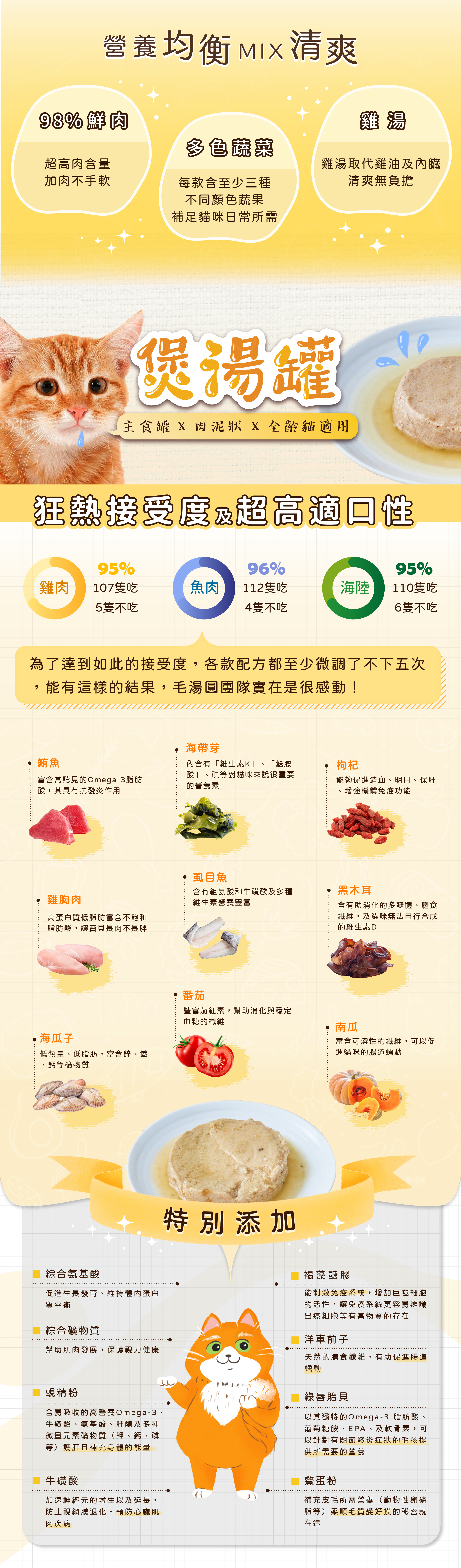 雞肉、鮪魚、海瓜子、雞肝、雞心、雞濃白湯、南瓜、黑木耳、褐藻醣膠、洋車前子
